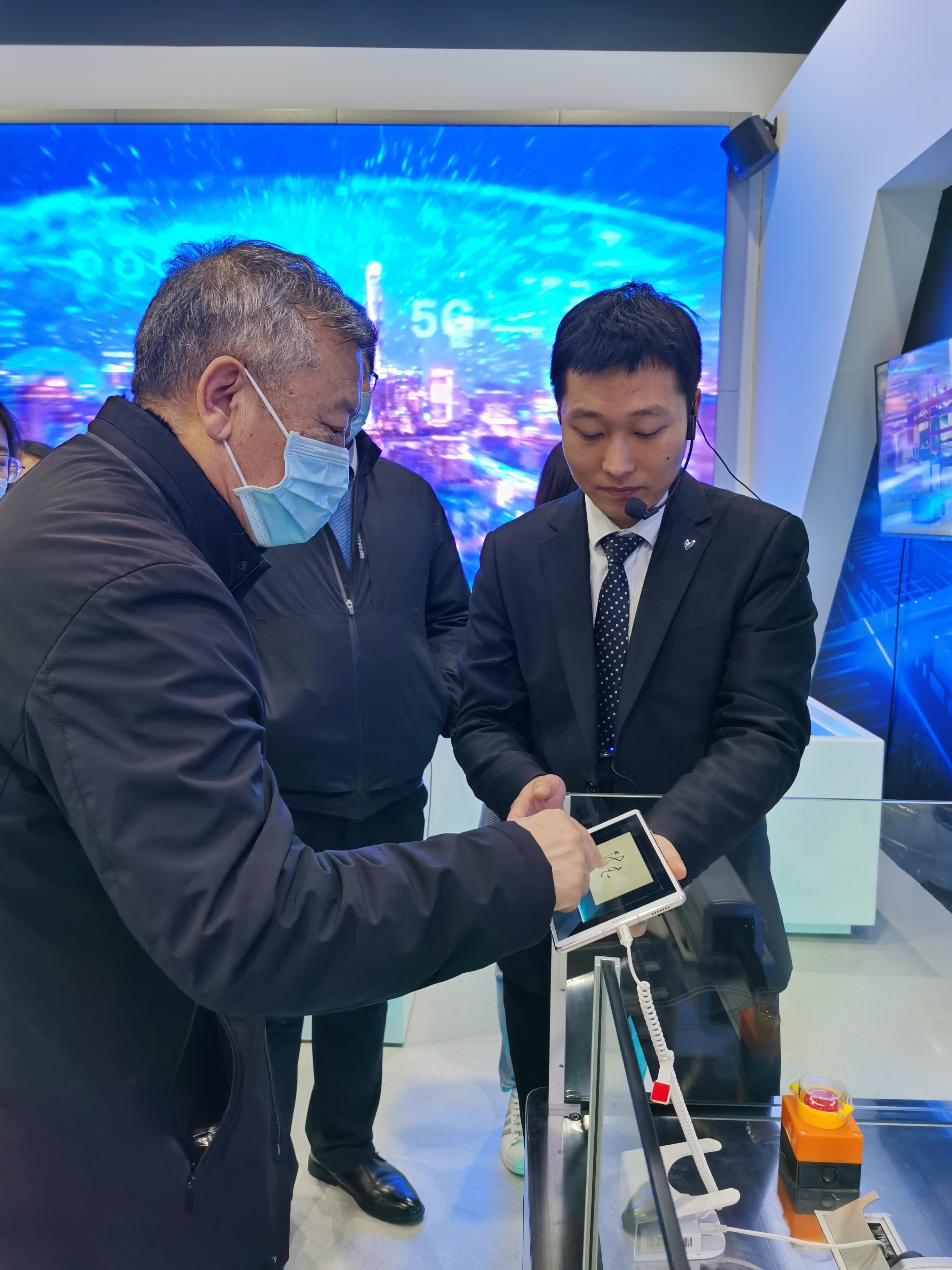 学院教职工在学习参观、聆听讲解的过程中,积极参与项目互动体验,与乒乓球机器人对战、Robomaster、体验名片定制等环节,深切感受到了AI的发展给人们带来便捷与惊喜。